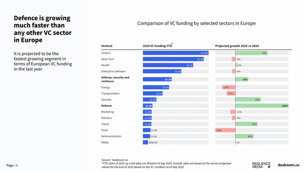 Investments in Europe’s defense tech have doubled this year – already hitting $1.5B and projected to reach $2.3B by year-end. Most of the funding goes to AI-powered systems, autonomous platforms, and drones, with Ukraine driving much of this innovation shift. Defense tech is no longer a domain – it’s Europe’s fastest-growing VC sector, and the field where Ukrainian teams are already setting global trends.